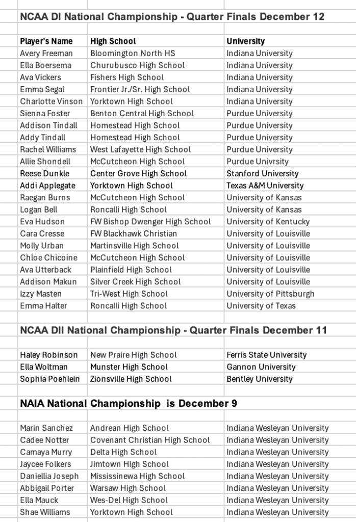 Indiana is considered to be one of the best states for high school volleyball. This remains true in 2025 with 22 players still in the hunt for a NCAA DI Women’s Volleyball Championship. (https://www.ncaa.com/sports/volleyball-women/d1). Three former greats are in the quarterfinals for a NCAA DII Volleyball Championship. (https://www.ncaa.com/sports/volleyball-women/d2)