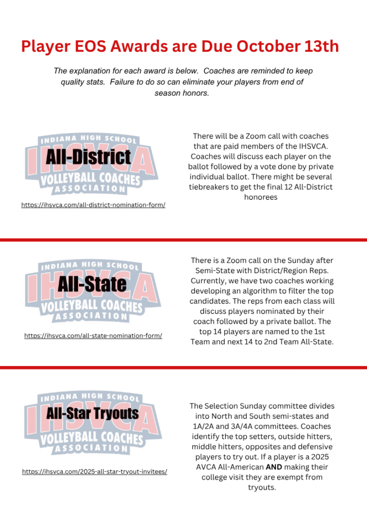• Deadline has passed for All-District, All-State and All-Star tryouts nominations.